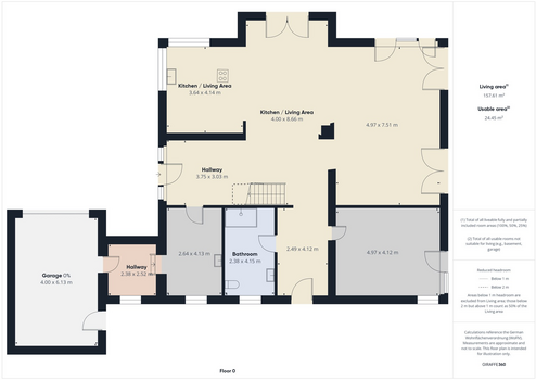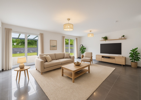 Offener Grundriss mit großzügigem Wohn- und Essbereich, angrenzender Küche, einem Schlafzimmer, einem Duschbad sowie einem Waschraum mit direktem Zugang zur Garage.