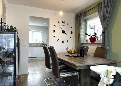 Im Erdgeschoss erwartet Sie eine offene und helle Raumgestaltung: Die moderne Einbauküche ist direkt in den großzügigen Wohn- und Essbereich integriert. Von hier aus gelangt man auf die Terrasse und in den gepflegten Garten – ideal für entspannte Stunden im Freien. Ein Flur mit Garderobenbereich sowie ein Gäste-WC komplettieren das Erdgeschoss.