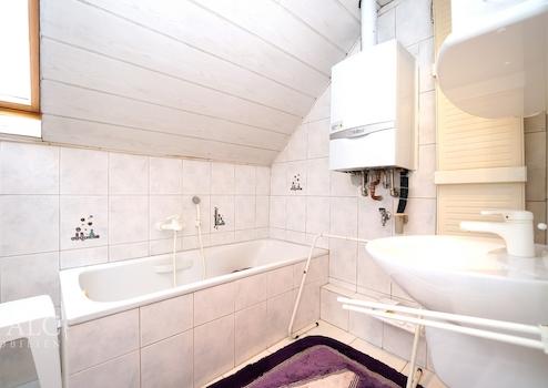 Das Badezimmer, versehen mit weißen Badfliesen, bietet Ihnen ebenfalls ausreichend Platz für Ihre Morgen- und Abendroutine. Es überzeugt mit einer Duschkabine mit Glastüren, einer zusätzlichen Badewanne, einem Waschbeckenbereich und einem WC. Alles, was Sie für Ihre tägliche Wohlfühlroutine benötigen.