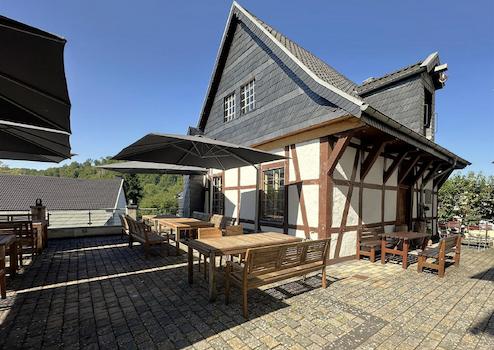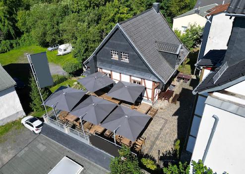 Das Obergeschoss verfügt aufgrund der Hanglage ebenfalls über einen ebenerdigen Zugang von der Jägerstraße aus. Hier liegt ein weiterer großer Gastraum mit eigener Theke sowie ein überdachter Balkon, der einen herrlichen Ausblick auf den Arnsberger Wald und die Kreuzkapelle bietet. Die angrenzende Außengastronomie umfasst rund 54 Sitzplätze und sorgt für zusätzliche Attraktivität.