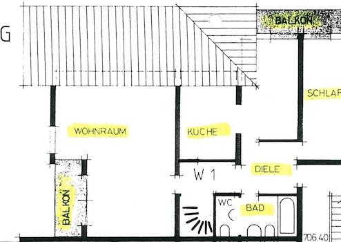 1. DG: großzügige Diele; Schlafzimmer mit Balkon; Badezimmer mit Badewanne, Waschmaschinenanschluss und WC; Wohnküche mit Ausgang zum Balkon; Wohnzimmer mit Zugang zum weiteren Balkon;