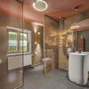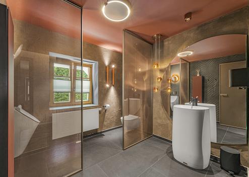 - großformatige Fliesen im Badezimmer sowie Designer Ausstattung