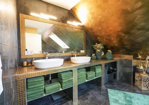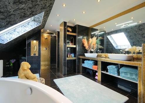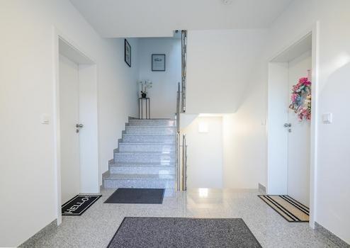 - Hochwertige Fliesen, wie Quarzkomposit, teilweise Vinyl oder Teppichboden