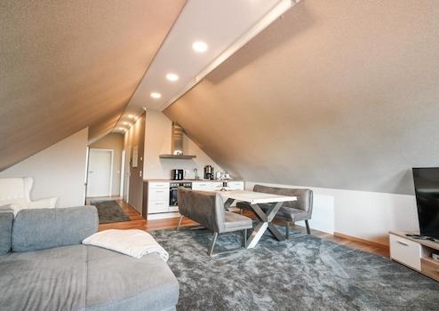 Spitzboden: Schlafzimmer, Bad, offener Wohn- und Essbereich mit Küche, Abstellraum, Diele