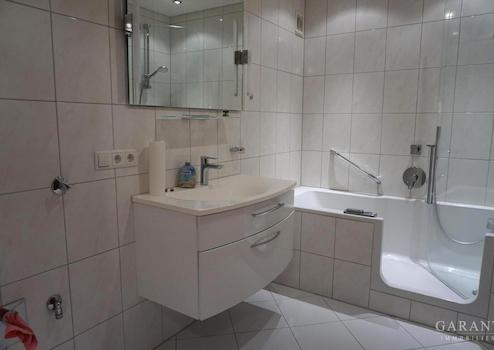 Das innenliegende Badezimmer ist hell gefliest und mit einer Badewanne ausgestattet. Zusätzlich steht ein separates WC zur Verfügung.