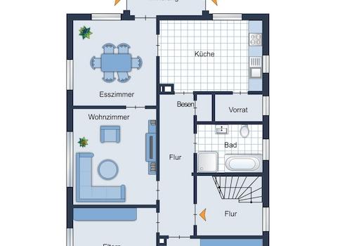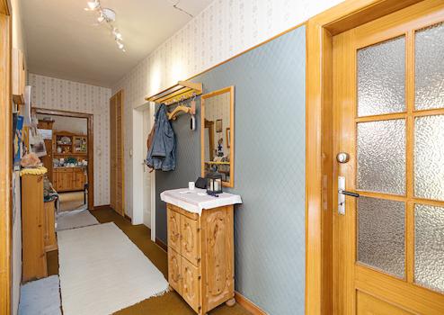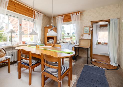Durch den Haupteingang betreten Sie eine geräumige Diele. Das Erdgeschoss umfasst ein großes Wohnzimmer, eine abgeschlossene Küche mit angrenzender Speisekammer, ein separates Esszimmer sowie ein Tageslichtbad. Ein Anbau aus dem Jahr 1964 erweitert den Eingangsbereich um einen praktischen Windfang, der zugleich als zweiter Zugang zum Haus dient und zusätzlichen Raum schafft.