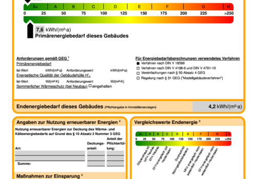 Die hervoragende Energieklasse wird durch den Energieausweis mit einem Endenergiebedarf von 4,2 kwh/m²A bzw. einen Primärenergiebedarf von 8,8 kwh/m²A bei Energieklasse A + d