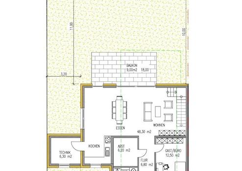 Die Planung für dieses Objekt sieht im Erdgeschoss einen großzügigen hellen Wohn/Essbereich mit offener Küche von insgesamt ca. 48 m² vor. Auf Wunsch kann die Küche geschlossen werden. Der Küche ist der Hauswirtschaftsbereich/Technik von ca. 6 m² zugeordnet. Aus dem Wohnraum gelangen Sie auf die attraktive Terrasse von ca. 18 m² und in den Garten. Das Erdgeschoss wird durch das Gäste-Zimmer/ Büro von ca. 13 m², das Gäste-WC sowie den Abstellraum von ca. 6 m² vervollständigt.