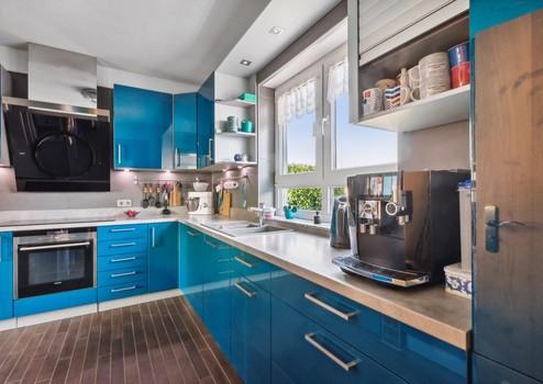 Im Erdgeschoss mit einer Raumhöhe von 2,65 m befindet sich die modern ausgestattete Einbauküche (z.B. grosses Induktionkochfeld, Dampfgarer und Wärmeschublade), ein grosses Wohn-Esszimmer mit Ausgang zum Garten über den neu gestalteten Balkon (12 qm), zwei weitere Zimmer und ein Bad.