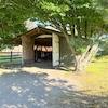 Pferdestall als Stahl-/Holzkonstruktion mit Satteldach auf der Koppel mit 3 Pferdeboxen und einer Freifläche vor den Boxen.