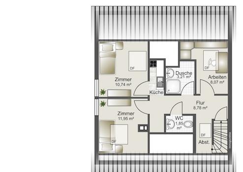 Über die Innentreppe wird das OG mit einer 3 Zimmer Wohnung, Küche und Bad erschlossen. Von hieraus haben Sie Zugang auf die riesige Terrasse die komplett entlang des Anbaus verläuft. Im DG befindet sich ein weiteres 2,5 Zimmer Apartment mit Küche Bad und WC.