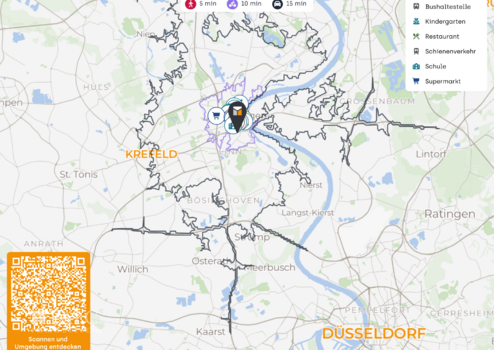 Die Lage ist ideal: Nur ca. 135 m zur nächsten Tram-Station und ca. 195 m zum Bahnhof Krefeld-Uerdingen. Einkaufsmöglichkeiten wie das Edeka-Center sind nur ca. 160 m entfernt. Für Freizeitaktivitäten bieten sich der nahegelegene Park und die Sportstätten an.