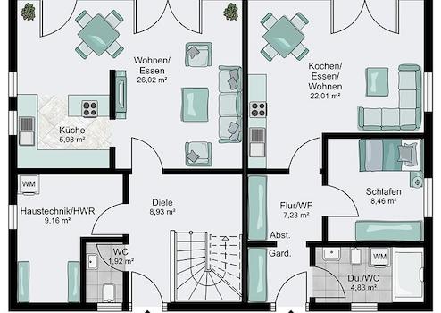Das zweigeschossige Mehrfamilienhaus mit zwei Wohnungen überzeugt mit einer klassisch eleganten Architektur mit Walmdach und zwei behaglichen Terrassen. Der Hausentwurf kann mit Stahlbalkonen an der Gartenseite ...
