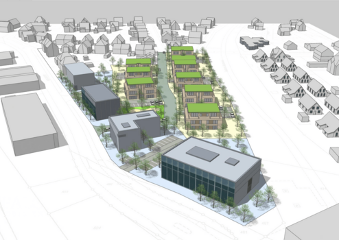 Zurzeit ist eine Bebauung mit zwei Vollgeschossen plus Staffelgeschoss im Bereich des Wohn- und Sozialbaus vorgesehen.