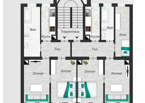 Die Gesamtwohnfläche von ca. 405 m² verteilt sich auf 7 Wohneinheiten, die jeweils als 2- bis 3-Zimmer-Wohnungen angelegt sind. Pro Etage befinden sich zwei Einheiten, was eine ausgewogene Mieterstruktur ermöglicht und das Haus zu einer stabilen Kapitalanlage macht.