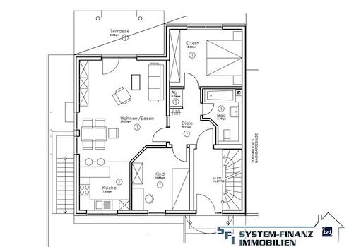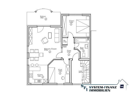 Obergeschoßwohnung 74,93 qm Wohnfläche, 3 Zimmer, offene Küche, Diele, Bad, großer Balkon;