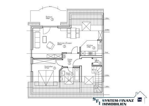 Dachgeschoßwohnung 59,70 qm Wohnfläche, 2 Zimmer, offene Küche, Diele, Bad, großer Balkon;