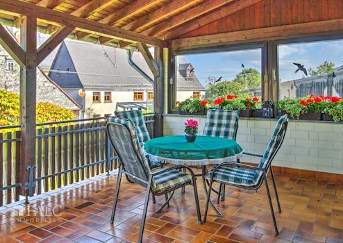 Über eine Außentreppe gelangt man zur großen überdachten Terrasse, die zum Entspannen und Verweilen im Freien einlädt. Von hier aus hat man Zugang zum Haus.
