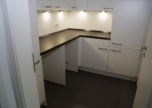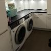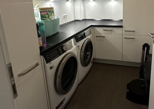 - Hauswirtschaftsraum mit deckenhohen Einbauten und Anschluss für Waschmaschine und Trockner