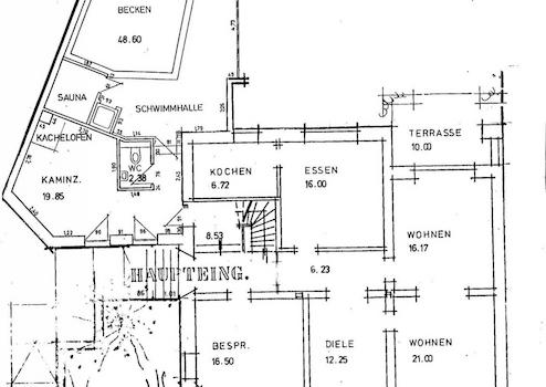 Diese Villa ist weit mehr als nur eine Immobilie - sie ist ein Stück Baugeschichte und bietet Ihnen die Möglichkeit, Wohnen, Arbeiten und historische Architektur unter einem Dach zu vereinen. Als Kulturdenkmal nach §2 Absatz 1 Hessisches Denkmalschutzgesetz aus geschichtlichen und künstlerischen Gründen in das Denkmalverzeichnis des Landes Hessen eingetragen. Quelle: https://denkxweb.denkmalpflege-hessen.de/objekte/ Der erste Schritt: Vereinbaren Sie einen Besichtigungstermin mit AS-Immobilien und verschaffen Sie sich selbst einen Eindruck von diesem seltenen Angebot. Raumaufteilung Garagengebäude: Platz für Fahrzeuge, derzeit teils auch als Öltankraum genutzt. Erdgeschoss: Bürofläche mit separatem Zugang und großzügige Terrasse über der Garage. Obergeschoss: Wohn-, Ess- und Kochbereich mit Gartenterrasse, Diele, WC und Besprechungsraum sowie Hobbyräume, ehemals Kaminzimmer und Schwimmhalle; Schwimmbad derzeit außer Funktion. Dachgeschoss: 3-4 Schlafräume und Badezimmer. Flächen im Überblick: Bürofläche ca. 93 m². Wohnfläche ca. 205 m². Nutzfläche (Hobby/Schwimmhalle, Heizung) ca. 55 m². Keller/waschen ca. 26 m². Im Garten ergänzt ein massives Grillhäuschen das Gesamtbild von Haus, Garage und Garten. Ausstattung & Zustand Die technische Ausstattung umfasst aktuell eine Öl-Zentralheizung (Firma Viessmann), Kunststofftanks sowie einen Elektroschrank aus ca. 1998. Stromleitungen stammen überwiegend aus den 1970er Jahren. Sanierungen sind erforderlich, Bodenbeläge, Sanitärbereiche, Malerarbeiten sind mindestens zu erneuern - eine ideale Gelegenheit für Liebhaber historischer Architektur, dieses Denkmal fachgerecht zu modernisieren und mit neuem Leben zu füllen. Kaufpreis dieser besonderen Immobilie auf Anfrage.