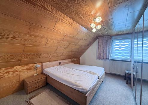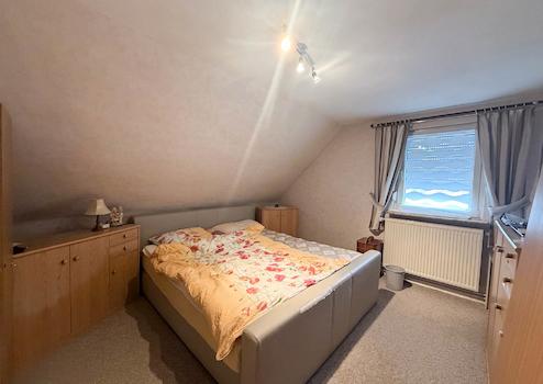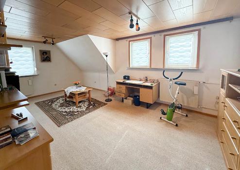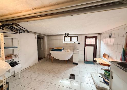 Im ausgebauten Obergeschoss gibt es neben drei Zimmern ein weiteres kleines Badezimmer mit Dusche. Ein Teil des Hauses ist unterkellert, aufgeteilt in den Heizungsraum und zwei Kellerräume, einer mit Ausgang in den Garten. Der von der seitlichen Terrasse zugängliche alte Stall würde sich hervorragend für die Erweiterung des Badezimmers im Erdgeschoss eignen (dies muss allerdings vorab bautechnisch geprüft werden).