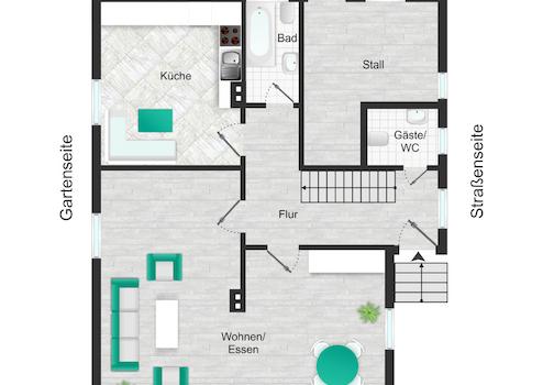 Über einen Vorbau betreten Sie das Haus, von hier aus erreichen Sie über den zentralen Hausflurbereich alle Räume, auch das Gäste-WC (inkl. Waschmaschinenanschluss). Die durchdachte Raumaufteilung mit angenehm großen Räumen lässt keine Wünsche offen. Das helle Wohnzimmer mit über Eck angeschlossenem Esszimmer bietet viel Platz für gemütliche Stunden. Die großzügige Küche mit Einbauküche und Platz für eine Familiensitzecke öffnet sich direkt zum Garten. Das kleine Badezimmer mit Badewanne vervollständigt das Raumangebot im Erdgeschoss.