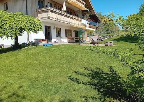 4-Zimmer EG-Wohnung mit Kachelofen, großer Doppelgarage und sonniger Terrasse, ergänzt mit viel Stauraum in einem gepflegten 3-Parteienhaus.