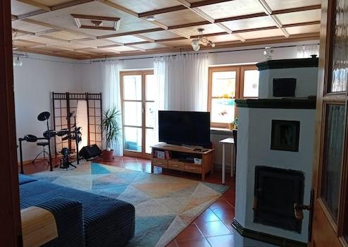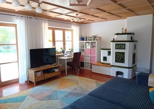 Das Herzstück der Wohnung bildet das große Wohnzimmer mit charmanten Kachelofen, der eine gemütliche Wärme in der kühlen Übergangszeit oder im Winter verbreitet. Wohlbefinden und Entspannung vermitteln der Blick über die großflächige Terrasse in den schönen Garten.