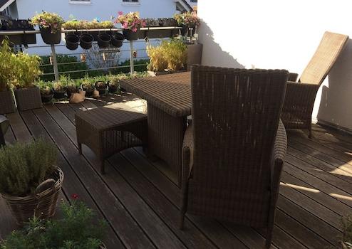 Sie hat eine schöne Terrasse, die sowohl aus dem Ess- als auch aus dem Wohnbereich so wie aus dem Bad zugänglich ist.