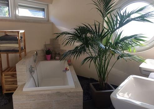 Vom Wohnbereich aus gelangen Sie direkt in das Hauptschlafzimmer sowie in das große Tageslichtbad, welches sowohl mit einer komfortablen Dusche als auch mit einer Badewanne ausgestattet ist.