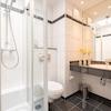 Das Badezimmer ist modern gestaltet, mit Dusche, WC und einer Lichtkuppel, die für natürliches Tageslicht sorgt.
