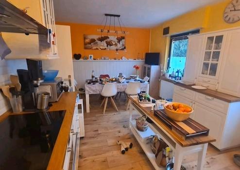 Im Erdgeschoss befindet sich die Küche und ein großes Wohnzimmer, ein Bad mit Badewanne und ein separates WC.
