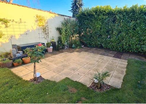Im hinteren Bereich des Gartens ist noch eine weitere Terrasse gepflastert. Im Garten ist auch ausreichend Platz für einen Aufstell-Pool.