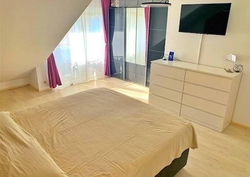 Eine weitere Besonderheit sind die drei Balkone: Ein kleiner Südbalkon, der von der Küche aus zugänglich ist, ein größerer Westbalkon, der vom Wohnzimmer aus erreicht wird und ein dritter Balkon, der sich an das Schlafzimmer auf der oberen Wohnebene anschließt.