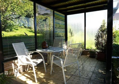 Das Wohnhaus selbst umfasst ca. 159 m² Wohnfläche, verteilt auf drei Etagen, und lässt sich flexibel als Ein- oder Zweifamilienhaus bewohnen. Im Erdgeschoss befinden sich drei Zimmer, eine Küche sowie ein Tageslichtbad mit Dusche, WC und Bidet. Zwei überdachte Terrassenbereiche – eine vor dem Hauseingang und eine weitere direkt vor der Küche – sind wind- und regengeschützt gestaltet und laden zum Verweilen ein. Eine Treppe verbindet den Terrassenbereich mit dem Garten und dem Wintergarten im Dachgeschoss.