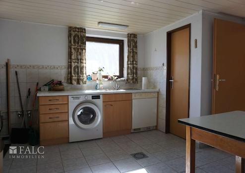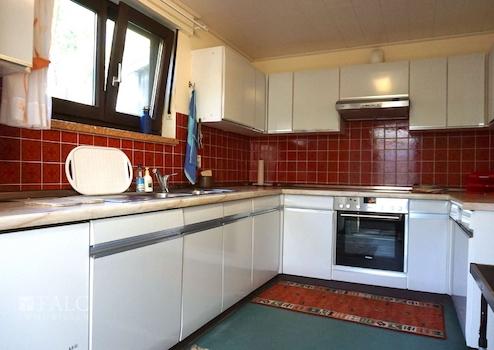 Das Kellergeschoss ist teilweise aus dem Hang herausgebaut und bietet im vorderen Bereich zusätzlich ein Zimmer, eine geflieste Küche sowie ein separates WC. Der rückwärtige Teil beherbergt praktische Lager- und Technikräume.