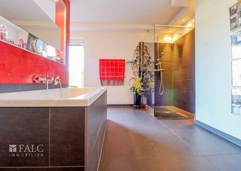 Eine breite begehbare Dusche, eine Wanne und zwei Waschtische bilden Ihren Wellness-Bereich.