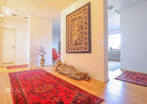 Der geräumige Flur führt Sie rechter Hand in das Schlafzimmer, das moderne Badezimmer, den Ankleidebereich und in Ihr eigenes Büro. Das Badezimmer ist zeitlos ausgestattet und verfügt zusätzlich über eine Badewanne und begehbare Dusche.