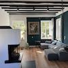•einen großzügigen Wohn- und Essbereich mit 3,50 m hohen Decken und Deckenbalken, Panoramakamin sowie direktem Zugang zur Terrasse und in den Garten (Fenster zu 3 Seiten hin),