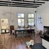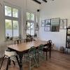 •einen großen, offenen Wohnbereich mit Küche, Kaminofen und originalem Dielenboden, hohen Decken und vielen großen Fenstern (Tageslicht von drei Seiten),