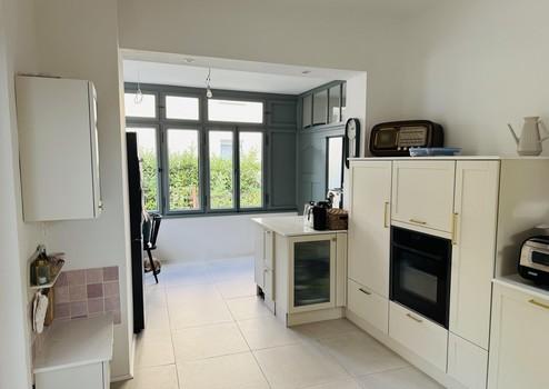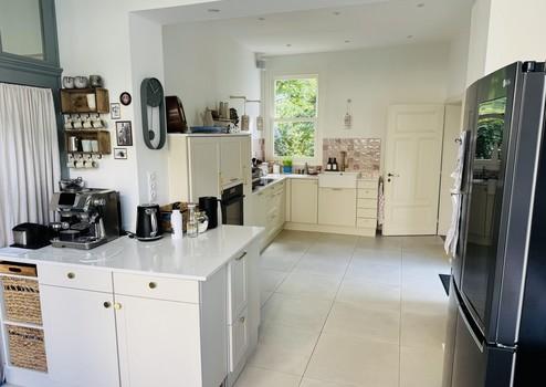 •anschließend an das Wohnzimmer eine separate, geräumige Küche mit Essplatz, großer Fensterfront, amerikanischem Schiebefenster und ebenfalls direktem Zugang zur Terrasse und in den Garten (Fenster zu 3 Seiten hin!),