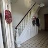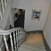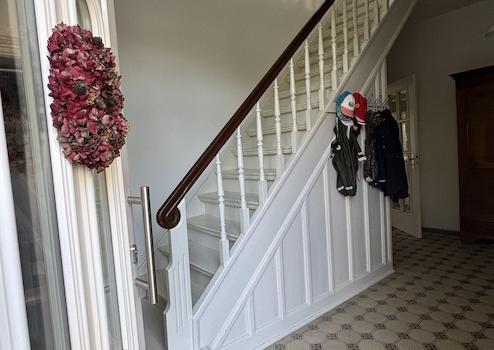 •ein helles Treppenhaus mit einer weiteren wunderschönen Holztreppe mit gedrechseltem Geländer,