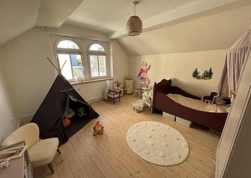 •zwei (Kinder-/)Schlafzimmer mit originalen, aufgearbeiteten Dielenböden und Rundbogenfenstern im Obergeschoss,