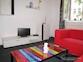 Wohnzimmer mit 2 Sofas, Couchtisch, Wohnzimmerschrank mit Digital-TV, Teppichboden.
