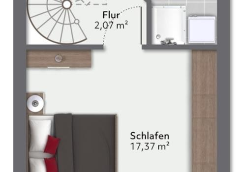 Die Wohnung erstreckt sich über zwei Ebenen, im 2. OG haben Sie das Schlaf- und Badezimmer.