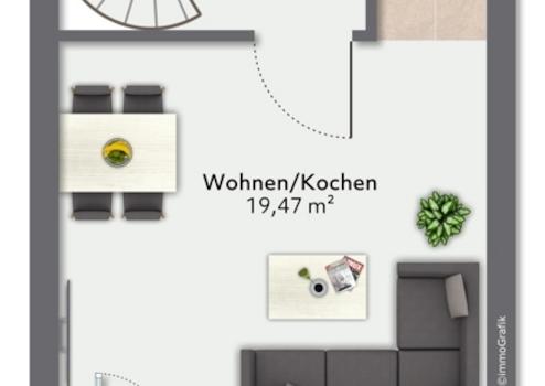 Im 3. OG befindet sich das Wohn- und Esszimmer mit Pantryküche und ein Abstellraum. Die beiden Etagen sind über eine Wendeltreppe miteinander verbunden.