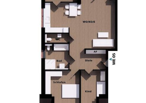 - Bad: Dusche (bodengleich, Echtglaswand), Wanne, WC, Waschtisch, Handtuchheizkörper