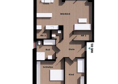 - Bad: Dusche (bodengleich, Echtglaswand), Wanne, WC, Waschtisch, Handtuchheizkörper