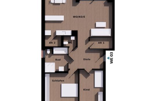 - Bad: Dusche (bodengleich, Echtglaswand), Wanne, WC, Waschtisch, Handtuchheizkörper