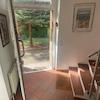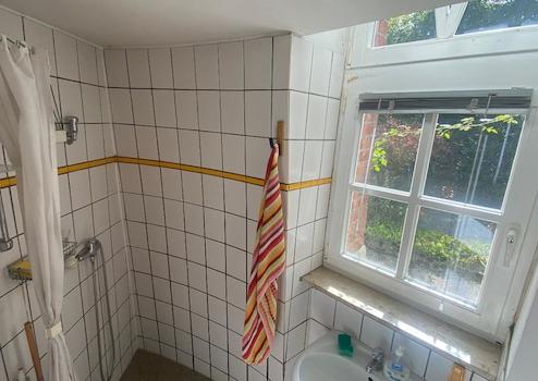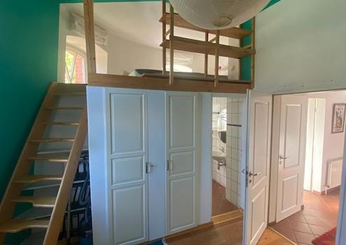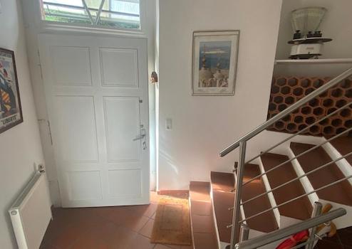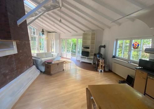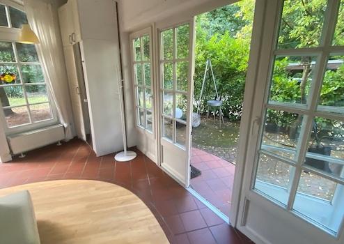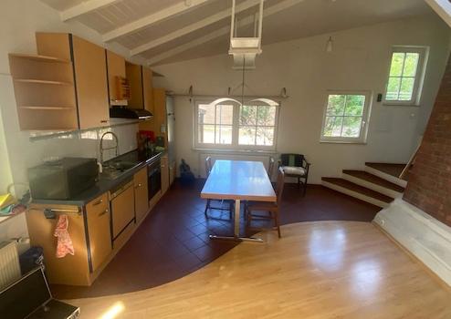 • Im Erdgeschoss befindet sich das größte der vier Apartments. Auf ca. 77 m² hatte der Eigentümer sich hier sein eigenes Reich geschaffen. Ursprünglich nicht größer als die anderen Apartments wurde es um 2020 durch einen lichtdurchfluteten Anbau erweitert. Es entstand ein moderner Raum, der als Wohnzimmer mit integrierter Küche dient, ein Raum, in den man sich wohlfühlt, den man nicht mehr verlassen möchte. Historische Mauern und transparente Architektur verschmelzen hier zu einer harmonischen Einheit.